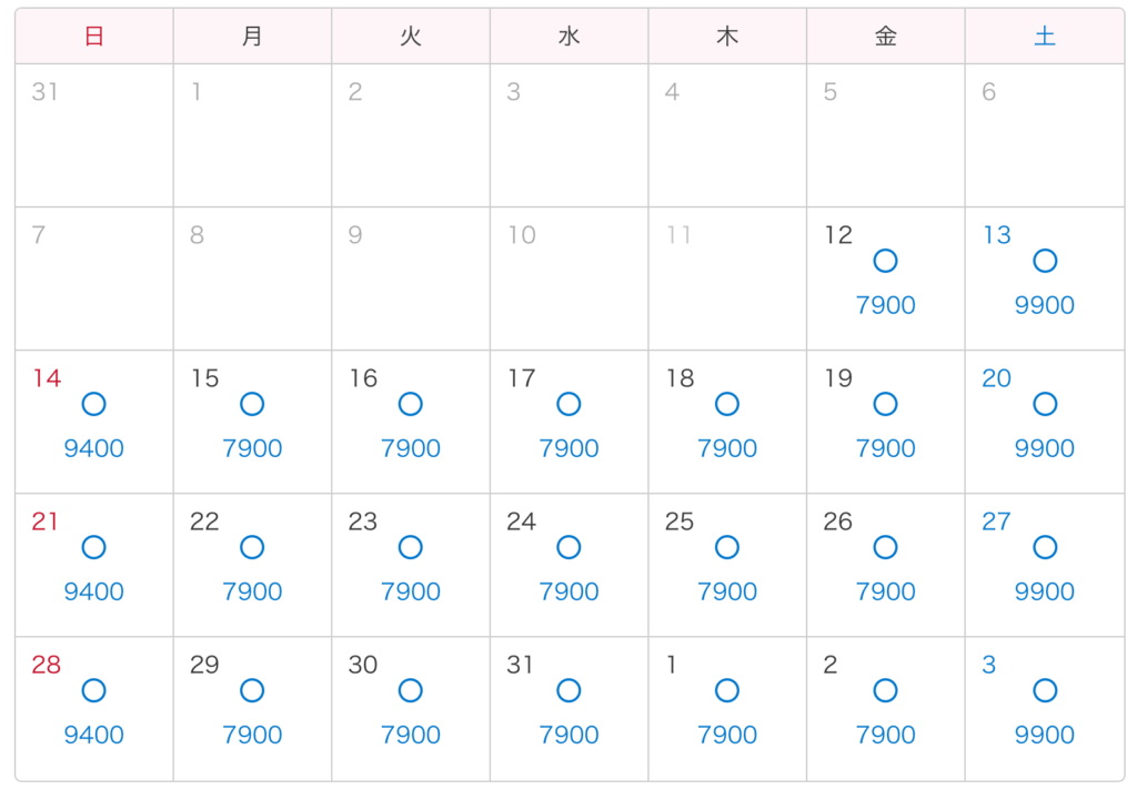 これはある閑散期のチケット料金ですが・・・ほとんど最安値の7900円に設定されています。