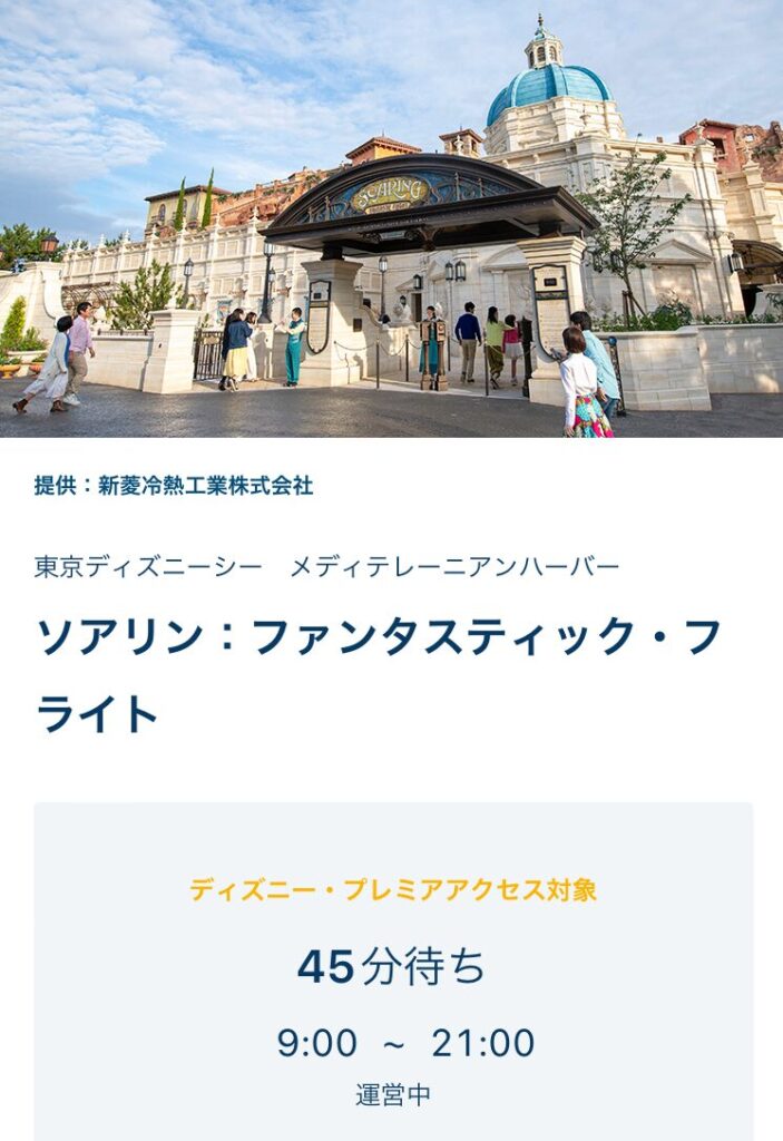 例えば平日シーの場合、1番人気のソアリンですら平均待ち時間60分前後でした。45分以下のタイミングも多々あり、しかもビリーヴ!開催中は30分以下になった瞬間を見ました。