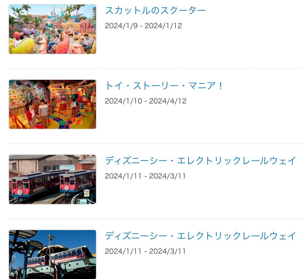 特に1月が多いのですが、アトラクやレストラン・ショー・イベントの休止施設が増える傾向があります。(これはある年の1月休止施設情報です)