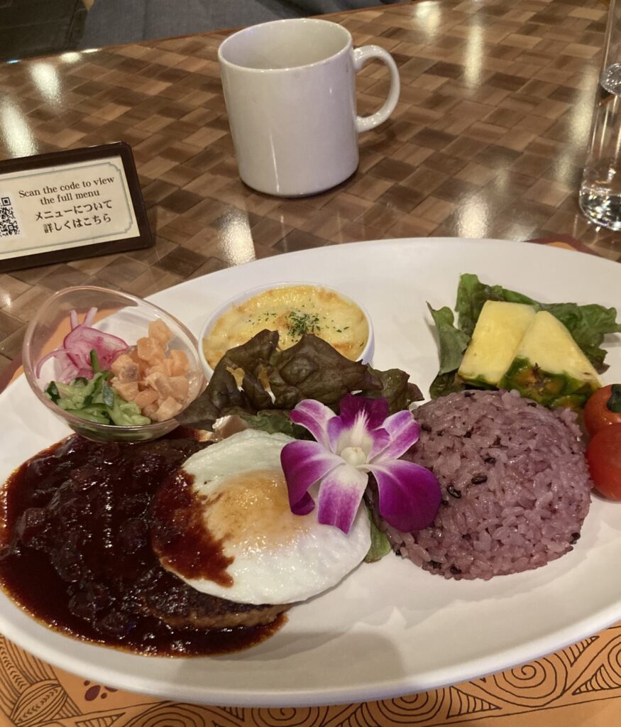 ハンバーグと黒米ライスがボリューミーで、お腹いっぱいになります。